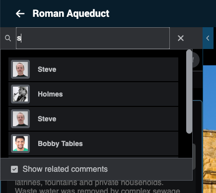 - Search for a commenter by name. Tip: If you check the box for “Show related comments”, you’ll see any threaded comments related to those made by the selected person.